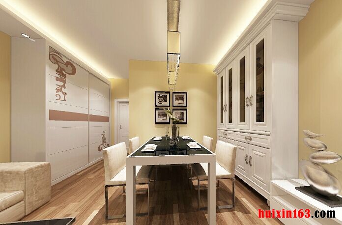 70平米的二居室,采用现代简约的装修风格,整个空间的居室面积并不是很大,通过设计师独具匠心的设计却显得比较时尚雅致,而且格局布置以及区域划分都比较合理,客厅所占据的面积并不大,满足该环境的基本需求,沙发靠墙布置,墙面以暖色系的壁纸铺贴,让简约的氛围彰显出一种温馨的效果,墙面三幅壁画的悬挂在狭窄的环境当中也能体会到一种艺术的气息,一侧就是餐厅的设计,中规中矩的布置虽然没有多大的看点,但一盏别致独特的吊灯却也将客厅的浪漫展现得淋漓尽致,储物柜基本都是以白色为主,大量的留白处理,也能营造出一种称心如意的居家环境。