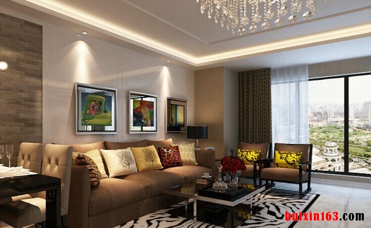 简约风的装修设计就是要展现出一种简单、时尚的美感,在本案例的实际当中,层高比较低,但通过色彩的完美装饰,也展现出一种不一样的风情,平顶式的石膏板吊顶,背景色彩以白色为主,以浅色系的色彩来做顶部装修,让空间显得比较清新,如果换成深色的色彩会产生一种头重脚轻的感觉,让人沉闷,一盏亮丽的水晶吊灯安装将空间的美提升一大档次,洁白的地砖与吊顶上下相互呼应,落地窗的设计搭配上轻质的窗帘,让空间的采光更加的舒适雅致,触目可及的室外景观与室内还起到一个相互借景的效果,个性的沙发布艺,茶几上一束妖艳的红色花卉同样将空间的美点缀的淋漓尽致。